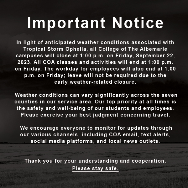 ELIZABETH CITY, N.C. — College of The Albemarle (COA) is appreciative of the opportunity to continue its strong partnership with Sentara Health, working together to expand opportunities for students and […]