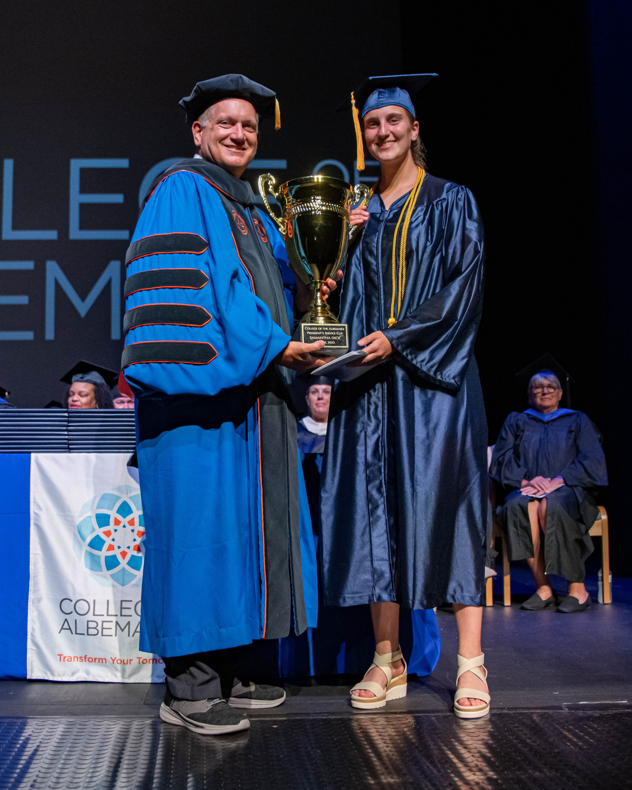 This year’s President’s Cup recipient exemplifies the spirit of leadership, service, and excellence that defines College of The Albemarle. Graduating with associate degrees in Arts, Science, and Engineering, Samantha has made a lasting impact both on campus and in the community. She has welcomed future students at open houses, improved operations and trained new employees at Corner Market Auctions, and dedicated her time to youth ministry, Special Olympics, blood drives, and local animal shelter initiatives. We are proud to recognize Samantha and congratulate her on this outstanding accomplishment.