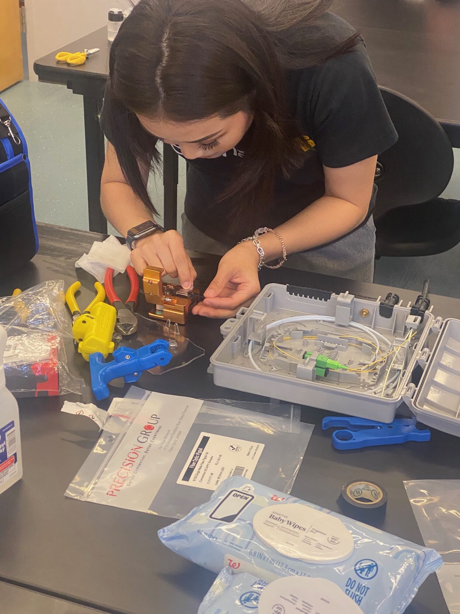 Altantsetseg “Alta” Batdorj is cleaving, cleaning, and prepping a fiber optic cable for splicing.